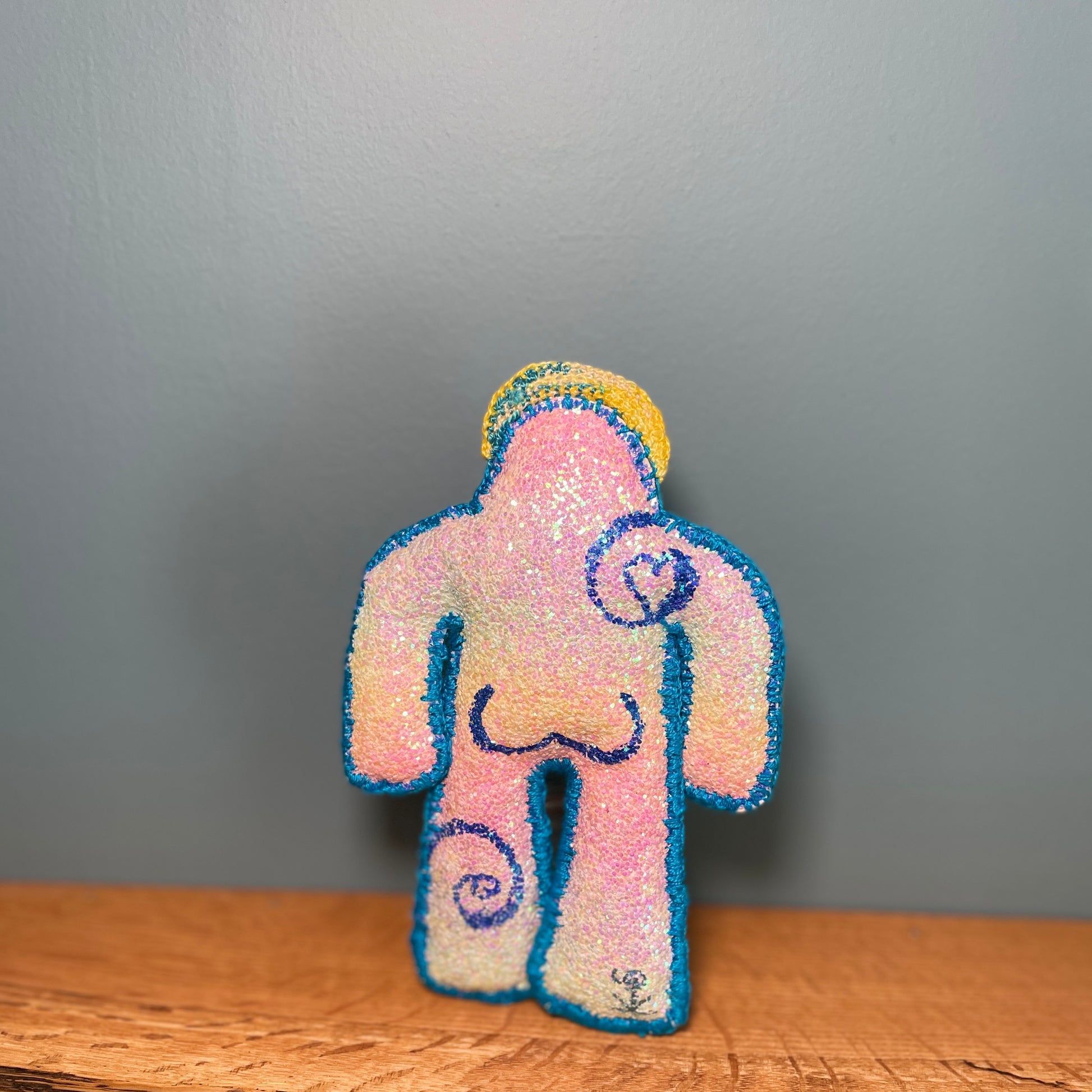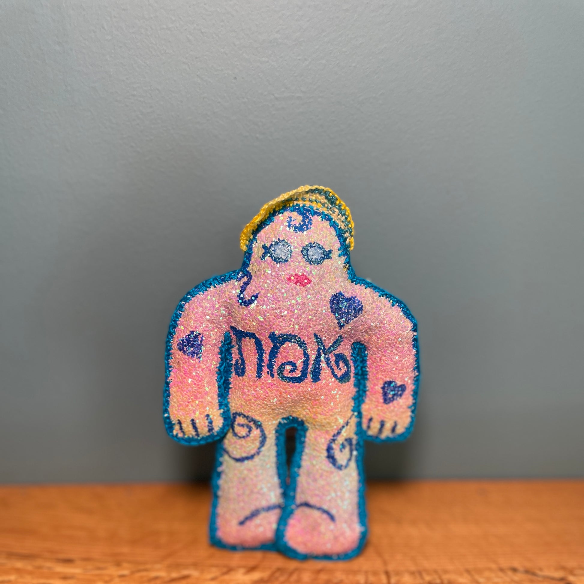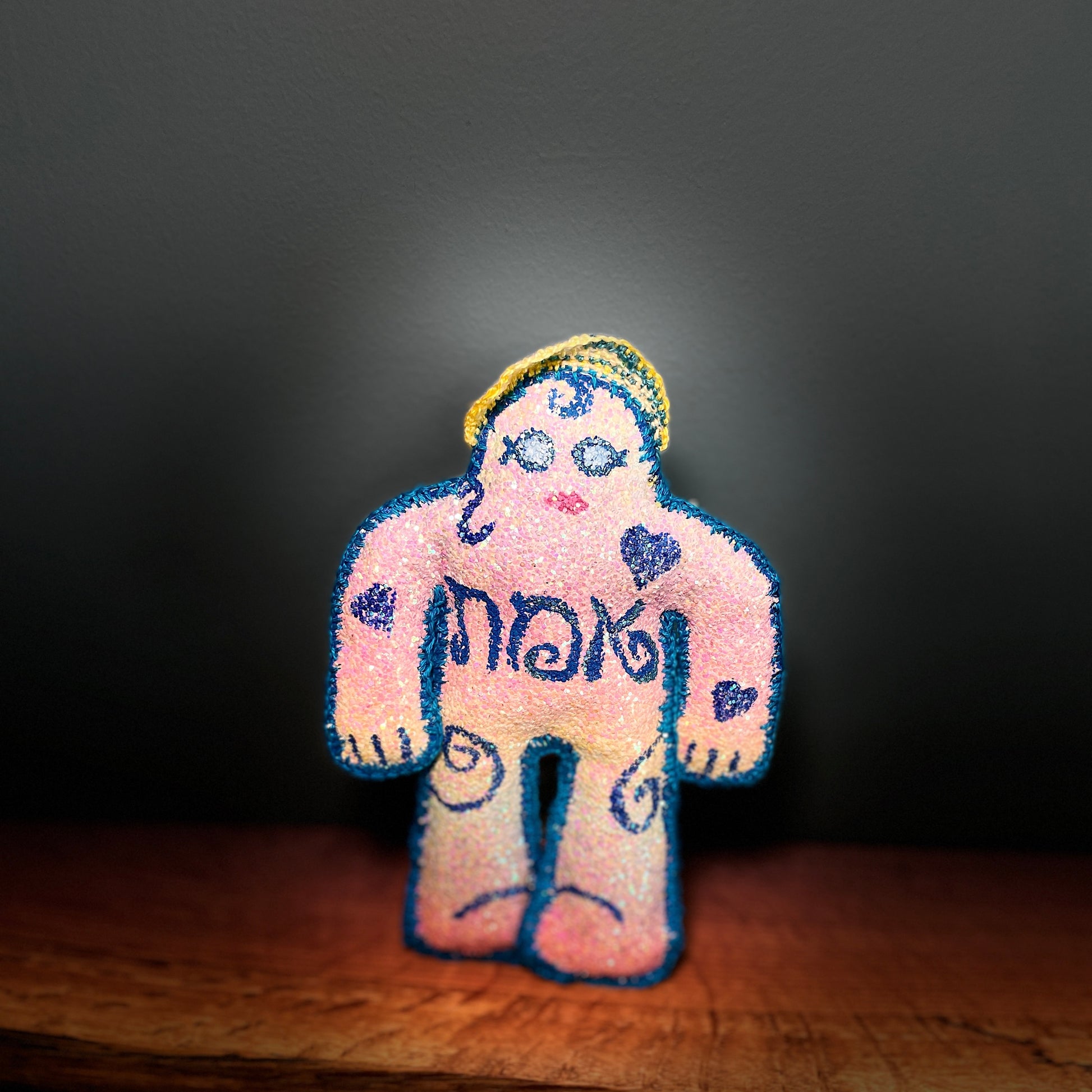 The golem/et is have the Hebrew word for truth (אמת) inscribed on its chest, which is an inherited practice. The Devotaj Sacred Arts golem/et of the COVID-19 pandemic can be specifically identified by a special symbol on their body. Some have it on each arm, others on their back, belly, or other location. This symbol is a “sigil” a power sigil that represents Psalm 33, which has been used in Jewish history to provide spiritual protection from plague and epidemics and inside each golem is a seed paper scroll with the final lines of Psalm 33 written on it in Hebrew sealed with an evil eye ward pin.