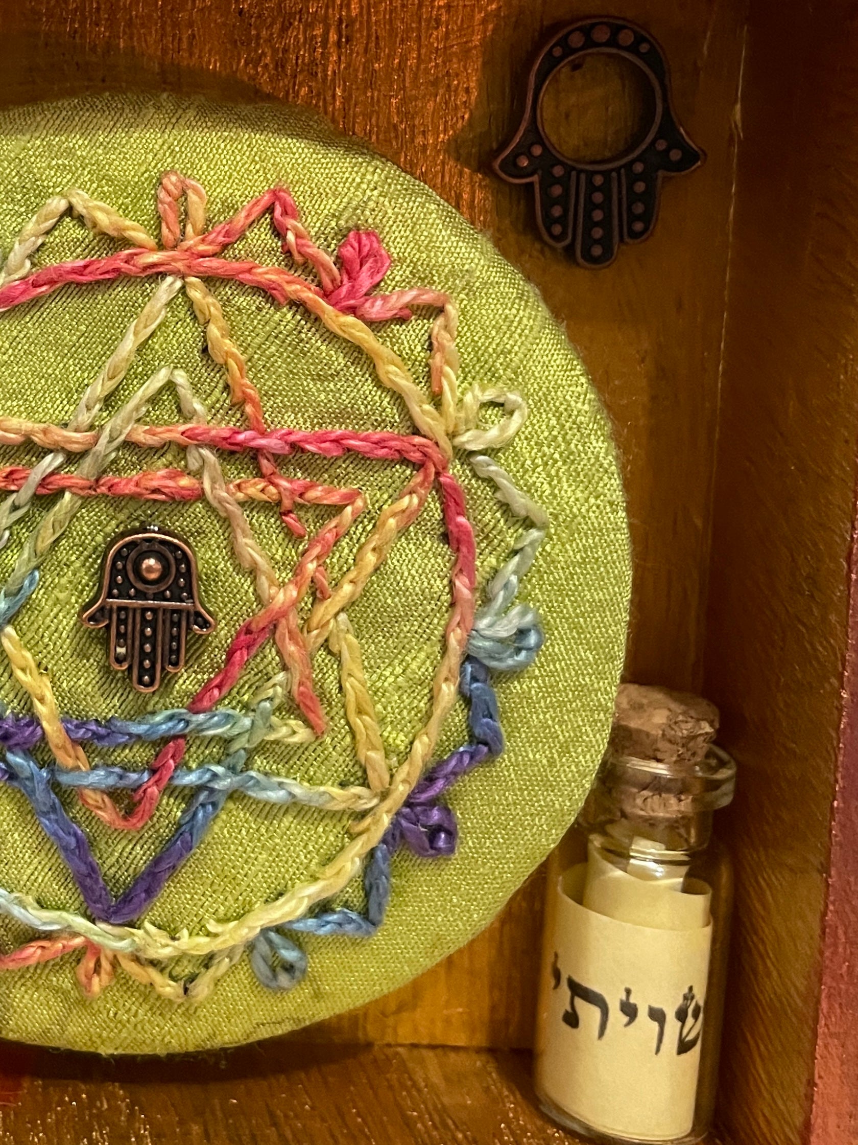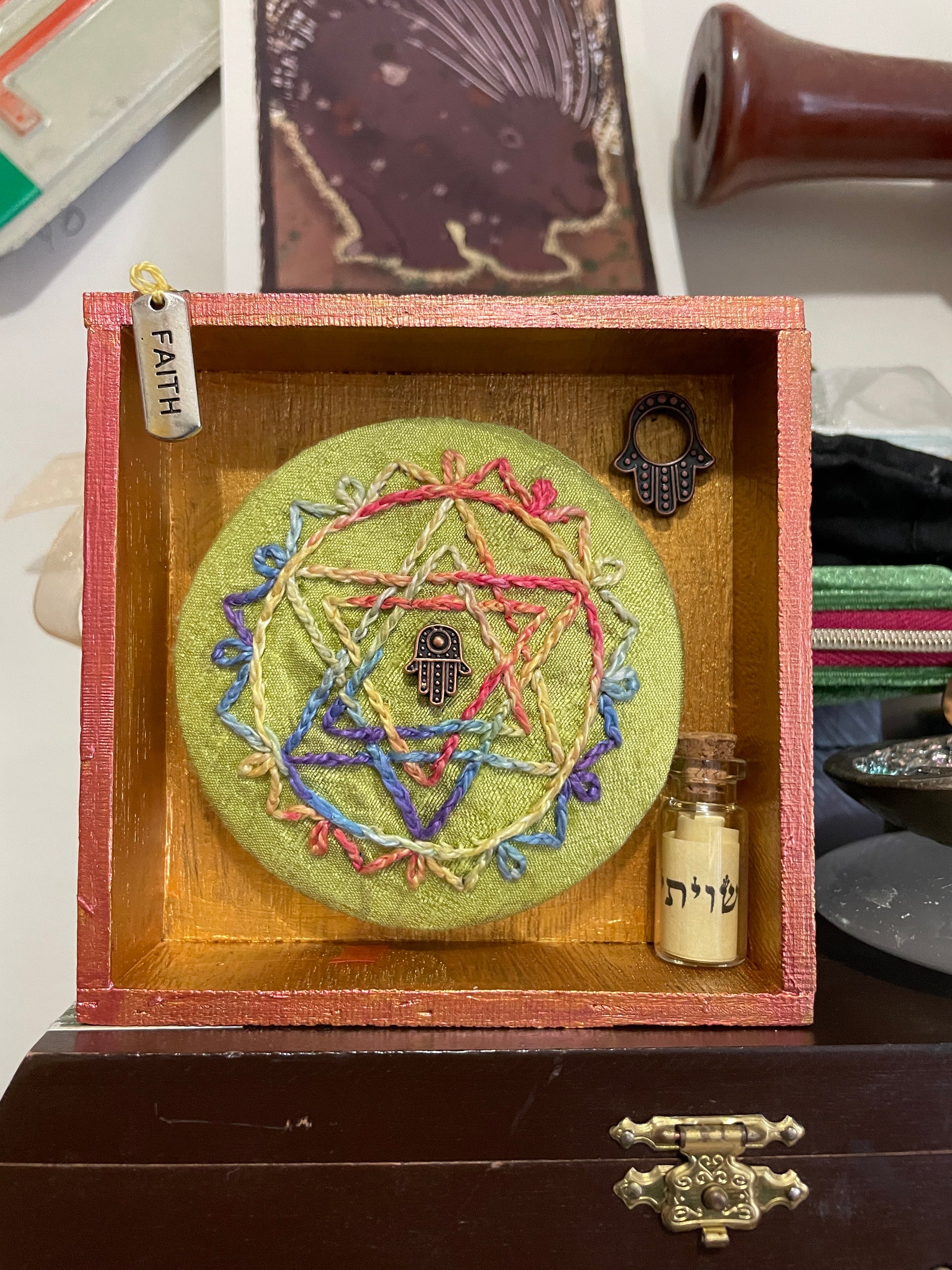 This 4” square mixed media shiviti shrine features a hand embroidered Magen David on green silk with a metal hamsa bead accent, set into a frame with a larger hamsa, bottle with scroll, and hanging charm that says “faith.”