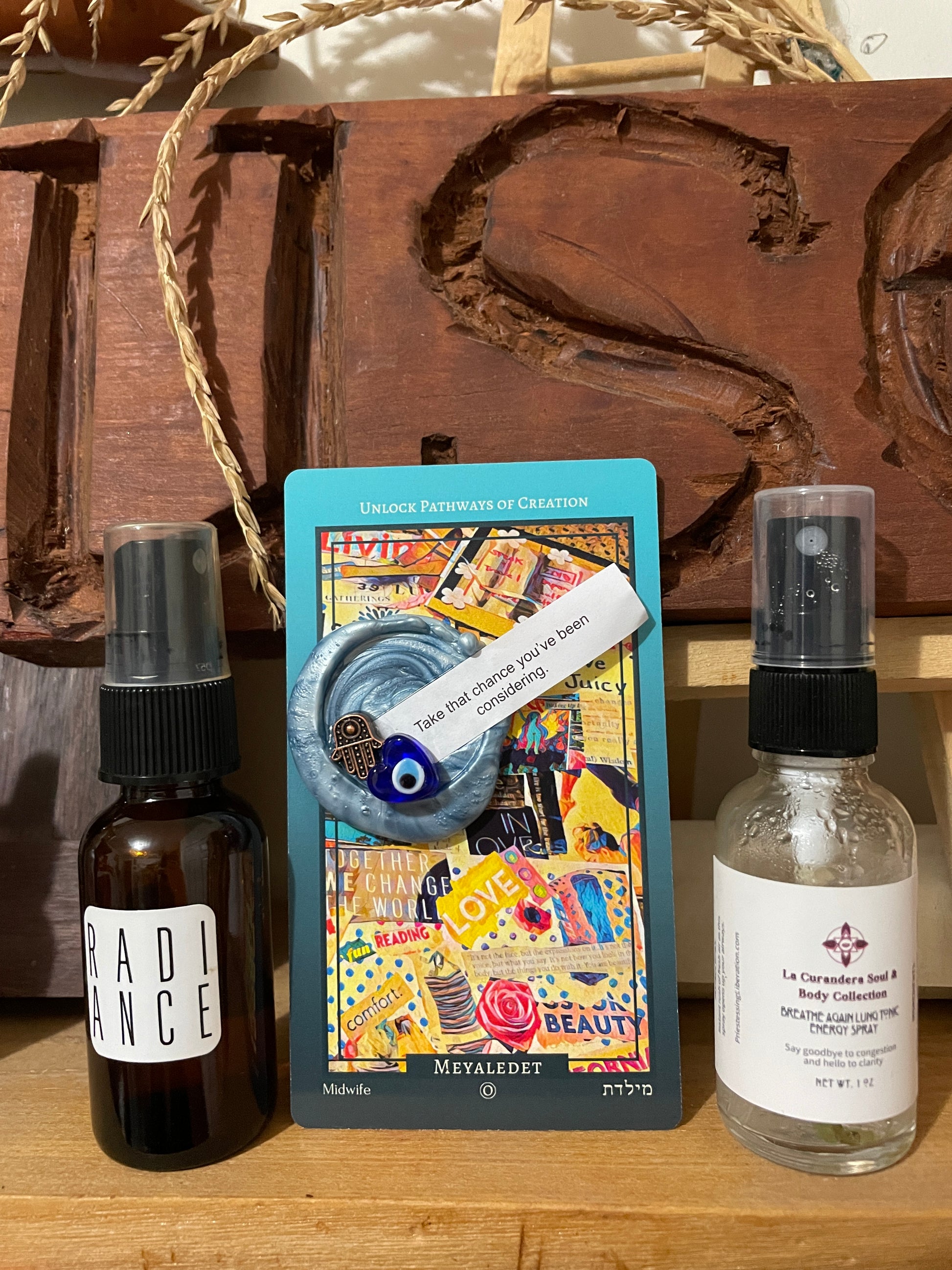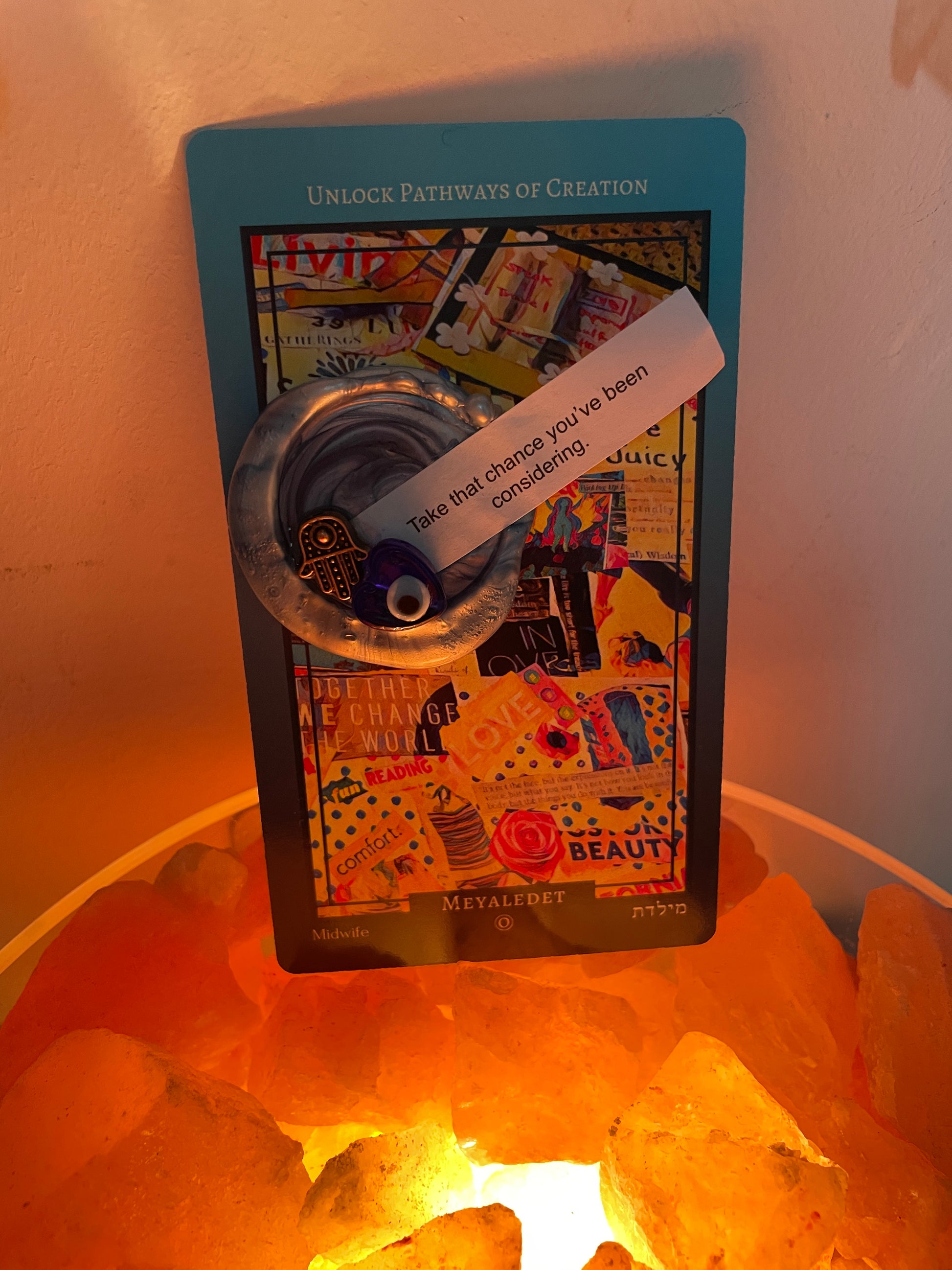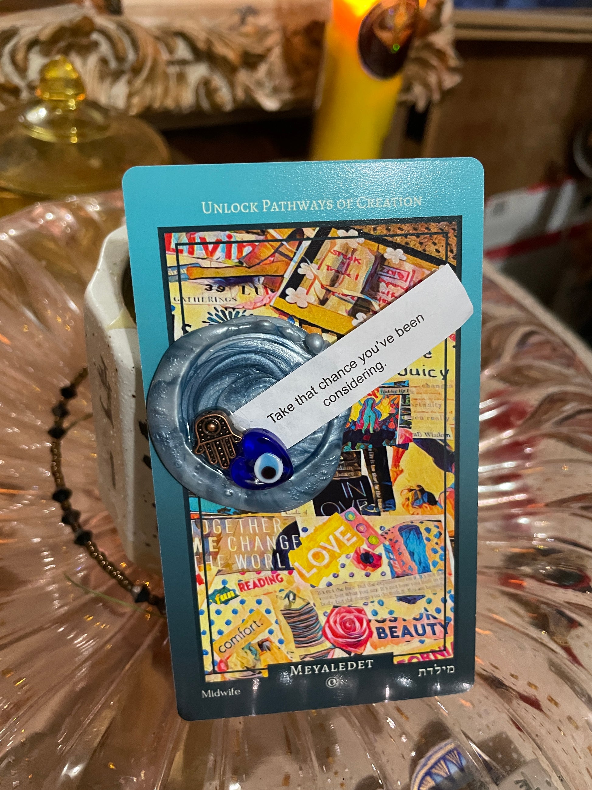 Netivot Talismans are one of a kind handmade talismans that includes a card from the Eit/Aht: a Netivot Wisdom Oracle, sealing wax, beads, and other embellishments such as fortune cookie fortunes. Each is unique and captures a special energy.
