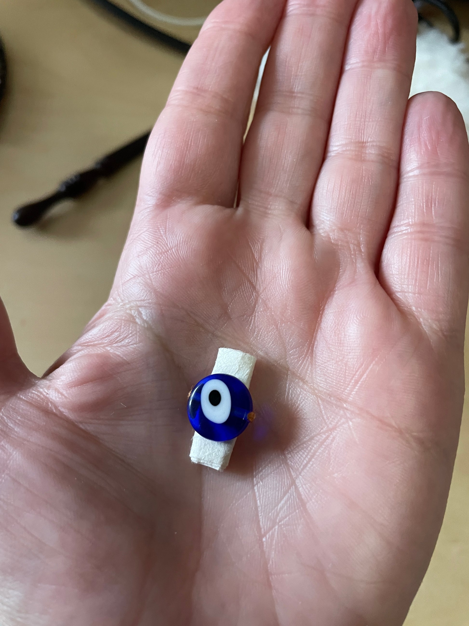 - Scroll (inside) with the final lines of Psalm 33 in Hebrew and evil eye ward pin