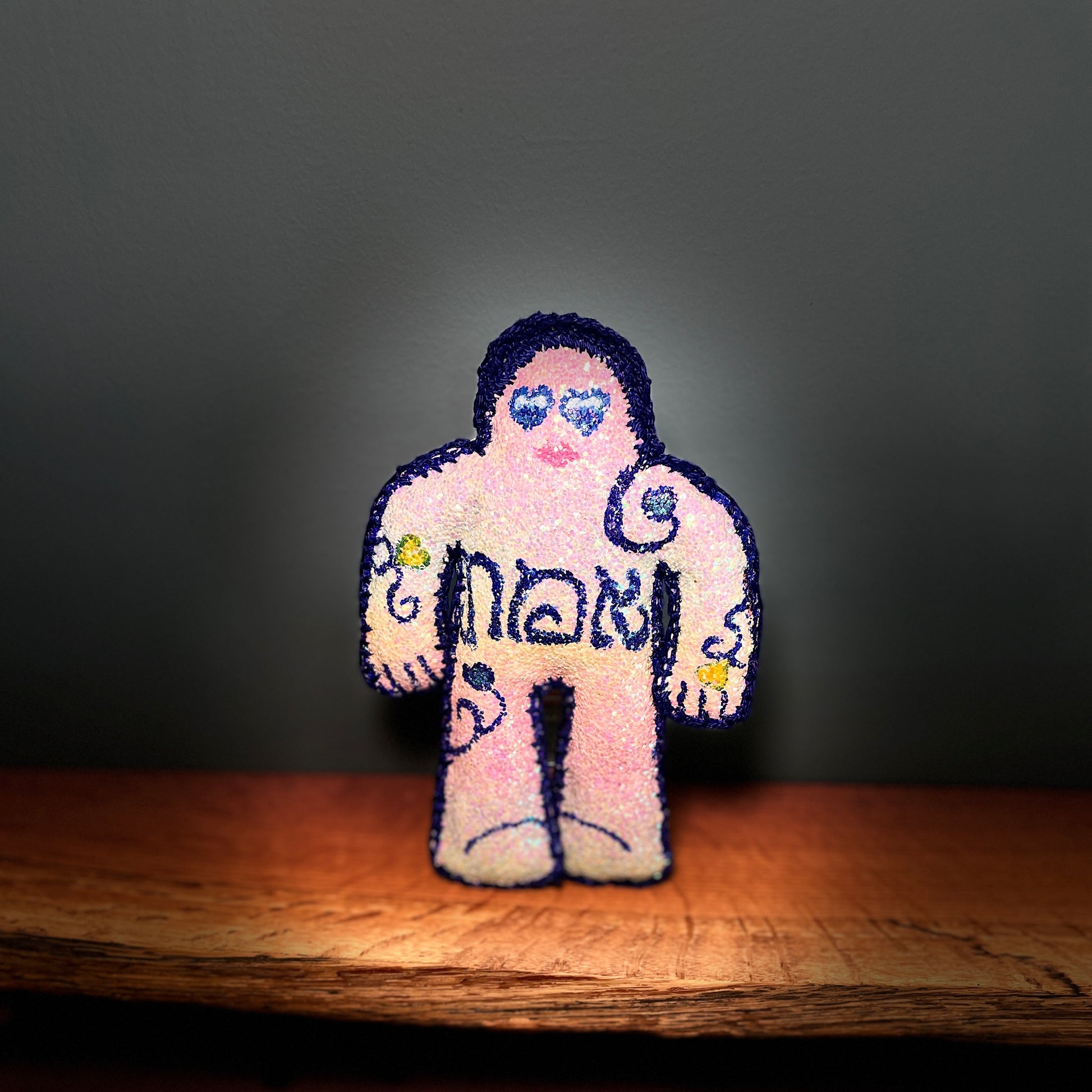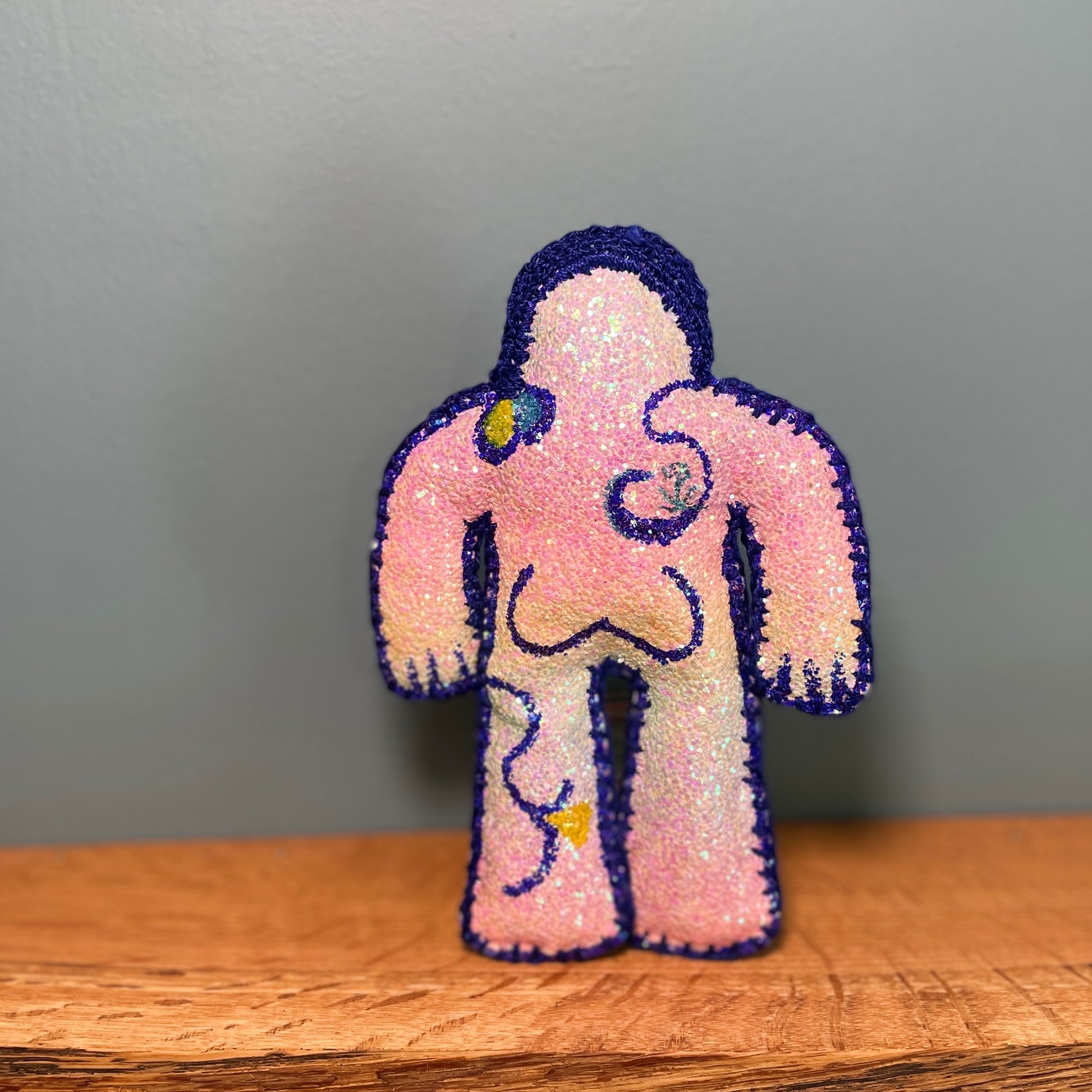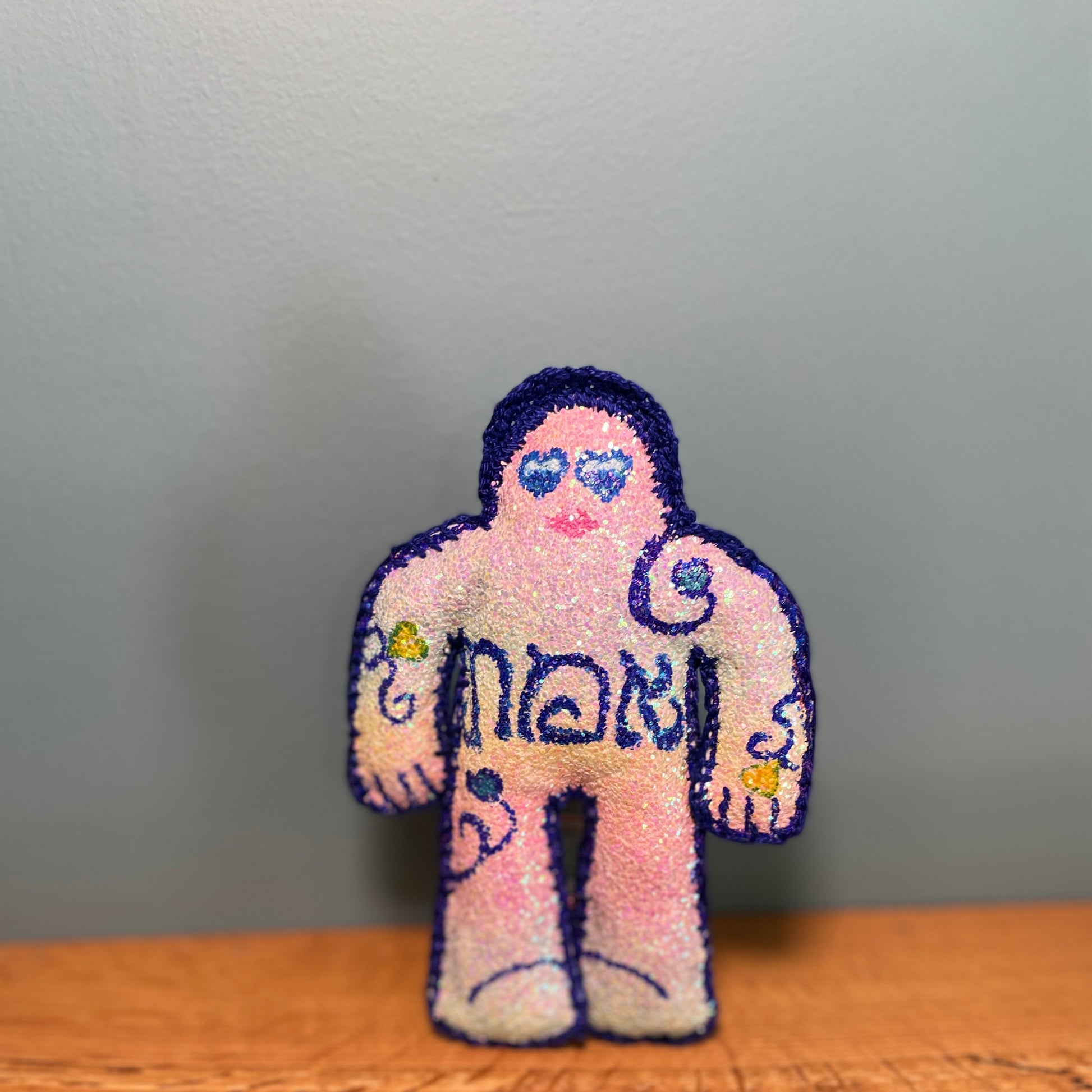 The golem/et is have the Hebrew word for truth (אמת) inscribed on its chest, which is an inherited practice. The Devotaj Sacred Arts golem/et of the COVID-19 pandemic can be specifically identified by a special symbol on their body. Some have it on each arm, others on their back, belly, or other location. This symbol is a “sigil” a power sigil that represents Psalm 33, which has been used in Jewish history to provide spiritual protection from plague and epidemics and inside each golem is a seed paper scroll with the final lines of Psalm 33 written on it in Hebrew sealed with an evil eye ward pin.