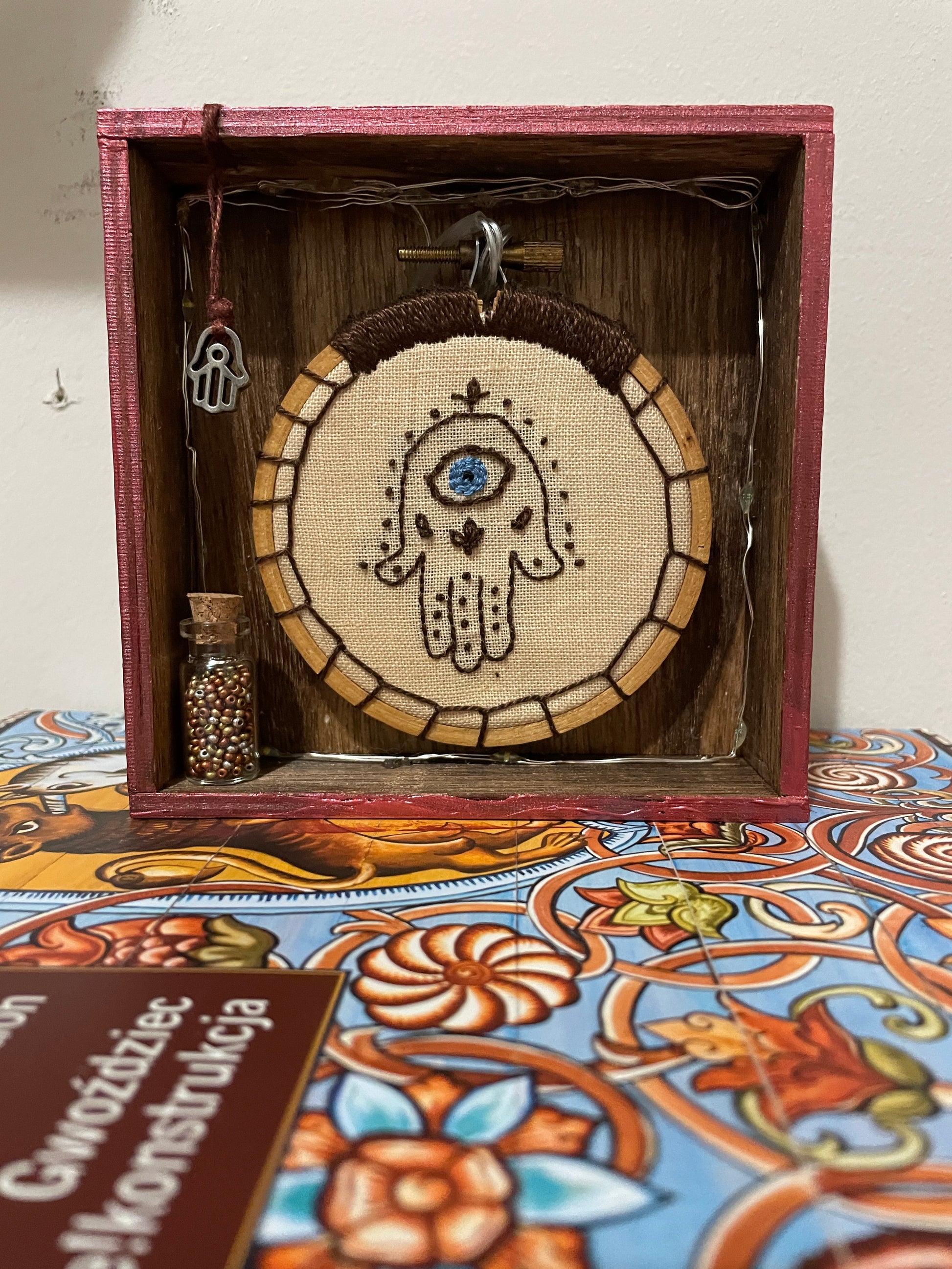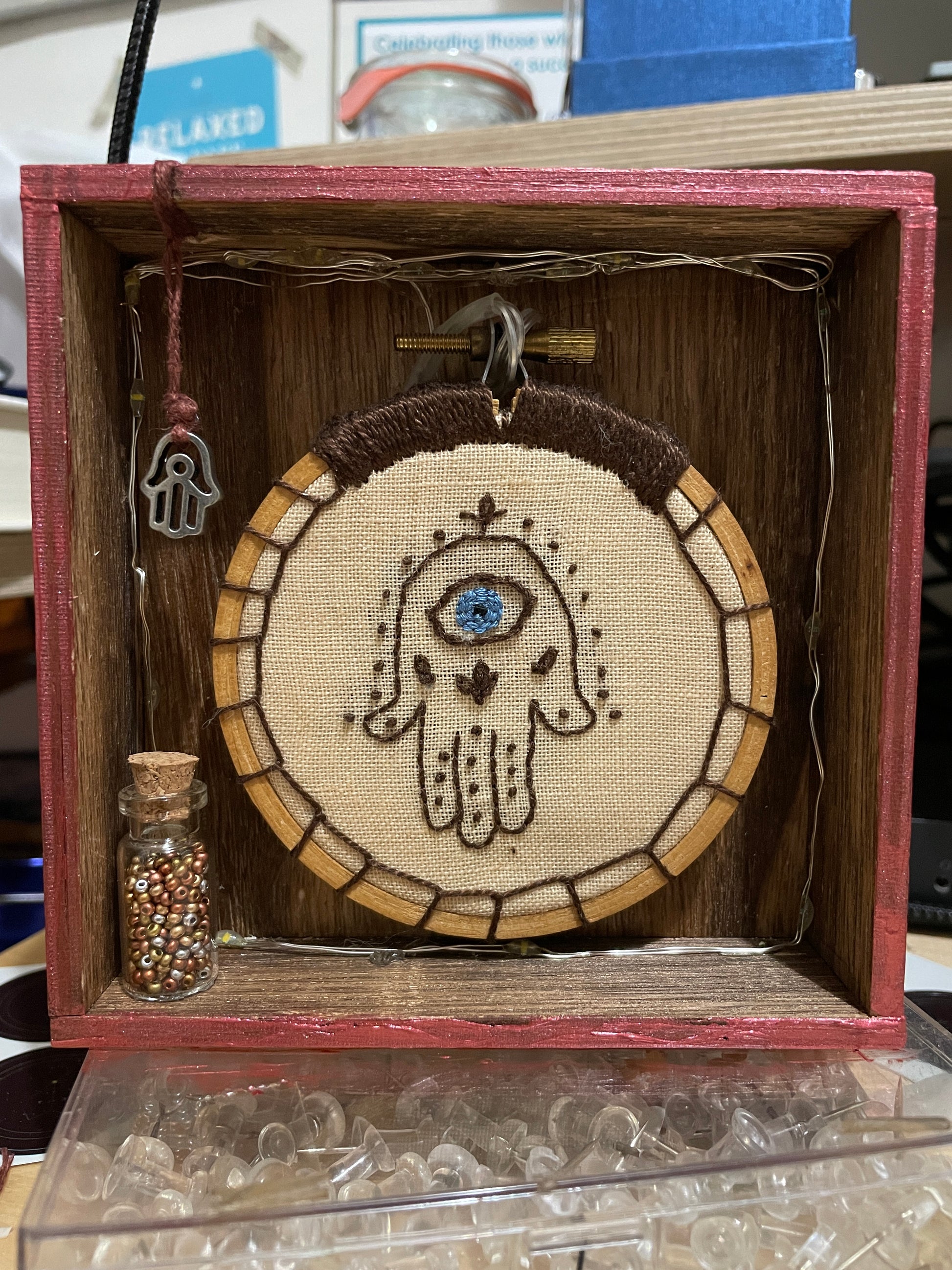 This 5” square mixed media piece can simply be a work of art featuring a hand embroidered hamsa and set into the frame with a hamsa charm and bottle of copper and silver beads …