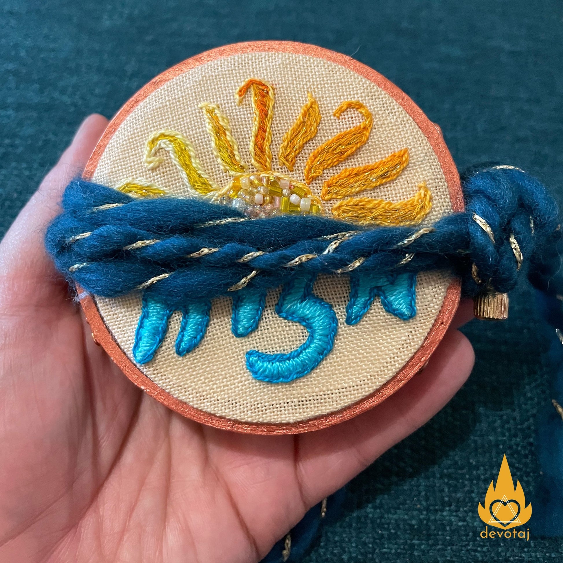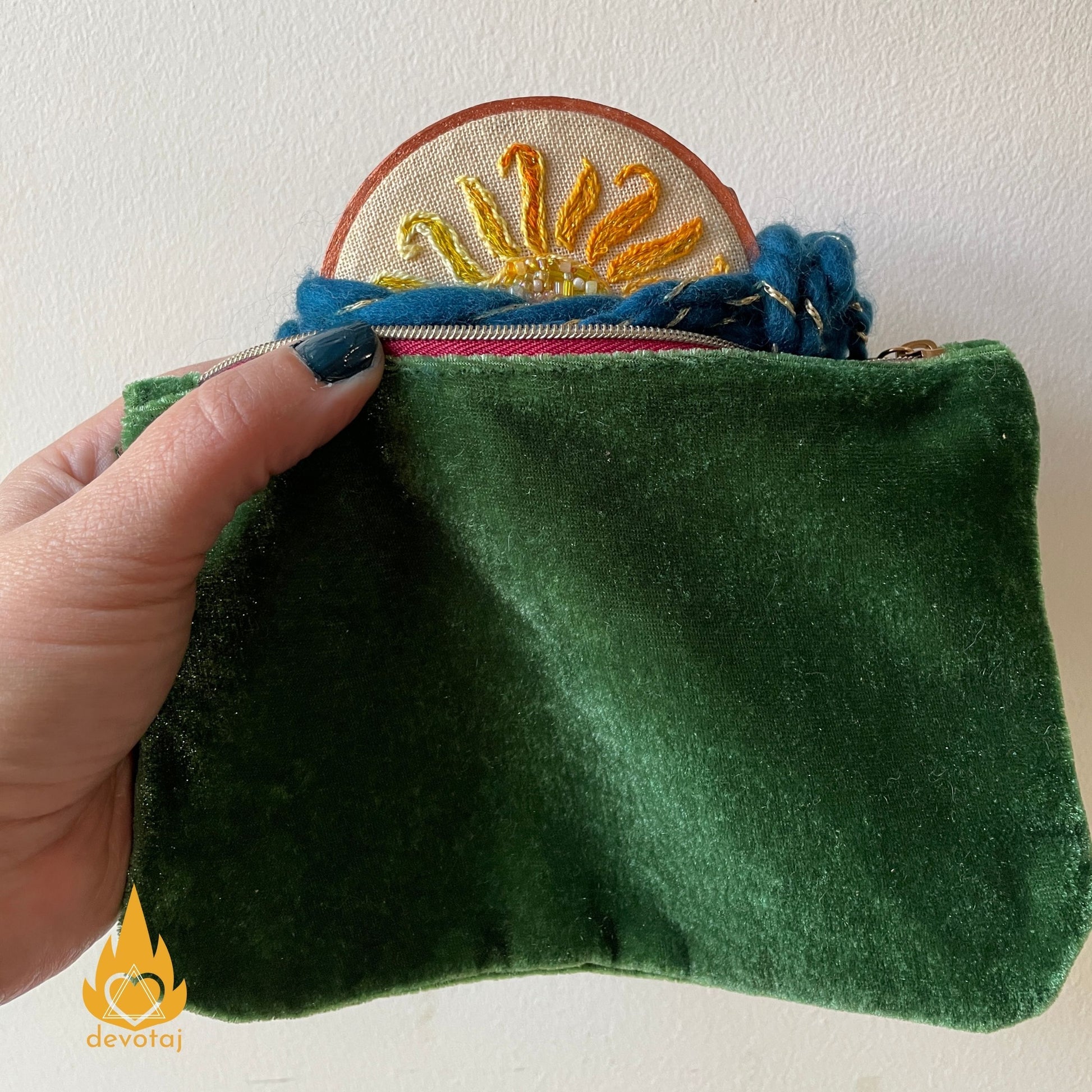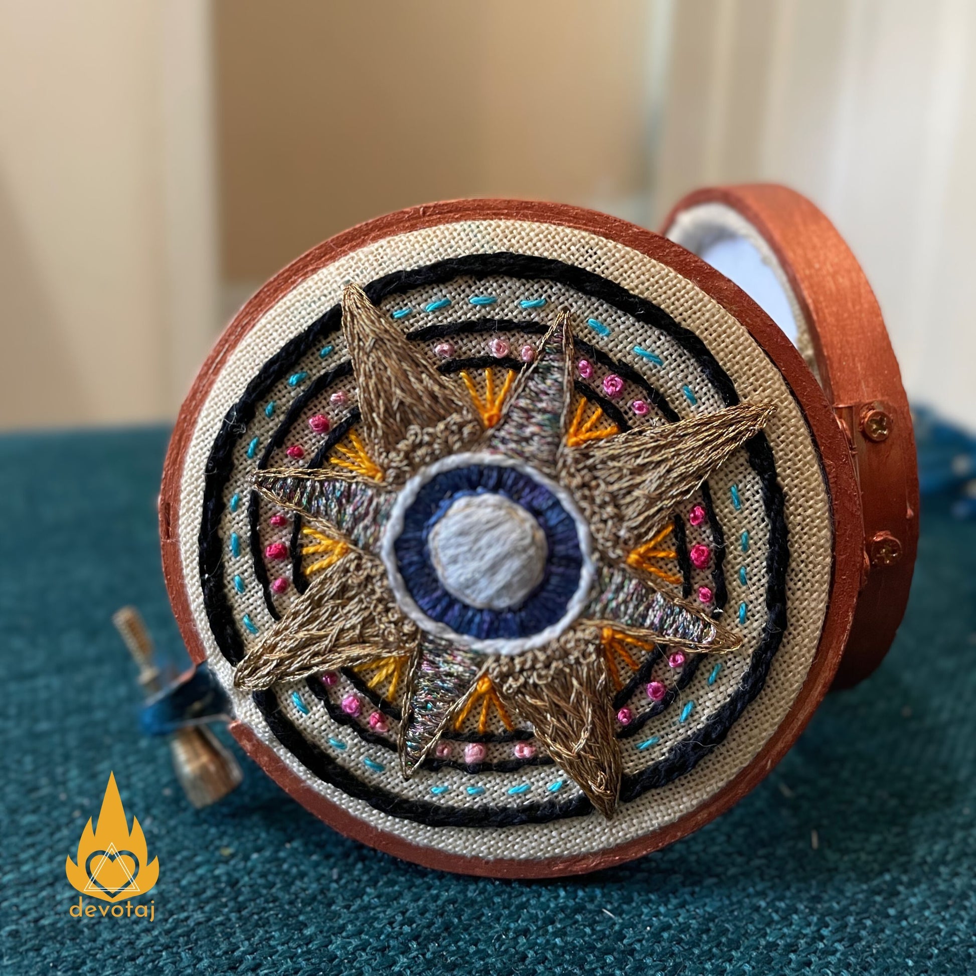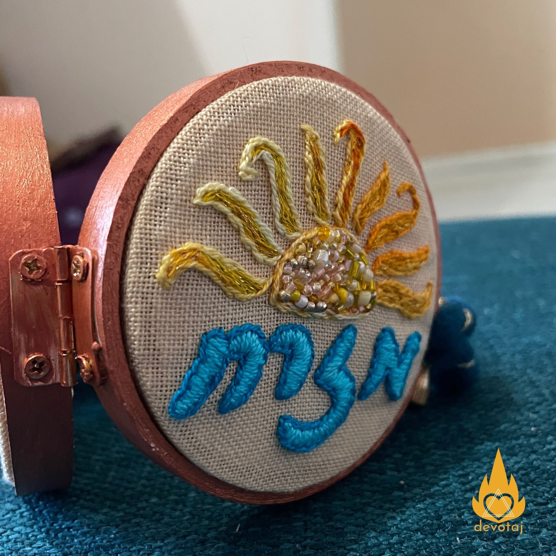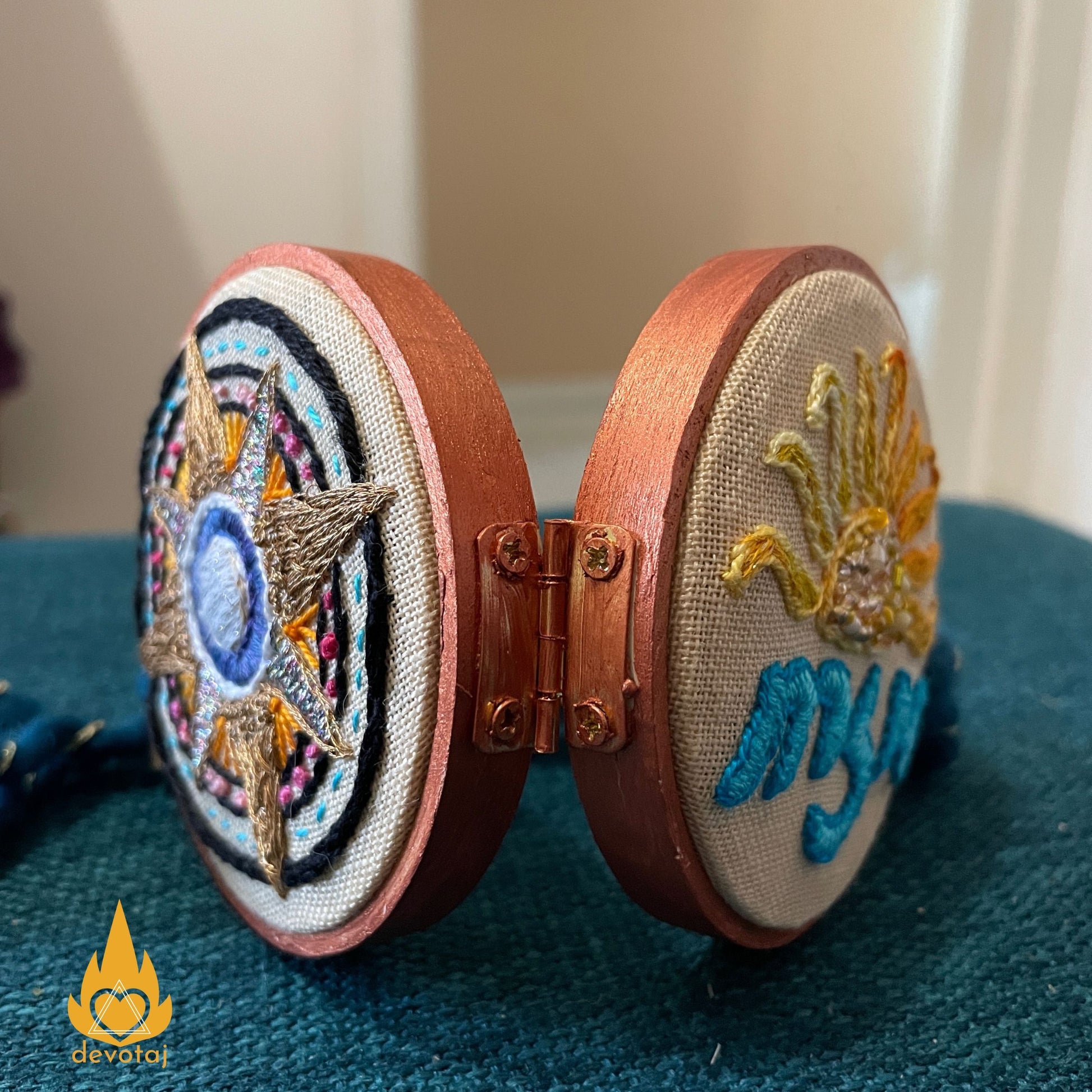 This pocket shrine has a hand embroidered mizrach (eastern direction amulet) on one side and a stylized compass design on the other, hinged together like a locket. The gorgeous hand spun art yarn cord is used to hold it closed when not in use. You can even store small items inside and it comes in an upcycled velvet pouch that also has room for a few more precious items.