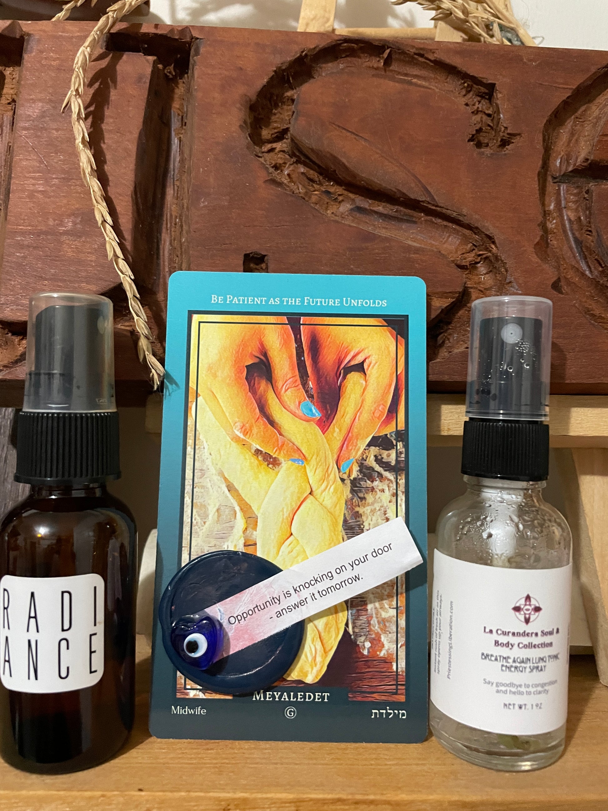 Netivot Talismans are one of a kind handmade talismans that includes a card from the Eit/Aht: a Netivot Wisdom Oracle, sealing wax, beads, and other embellishments such as fortune cookie fortunes. Each is unique and captures a special energy.