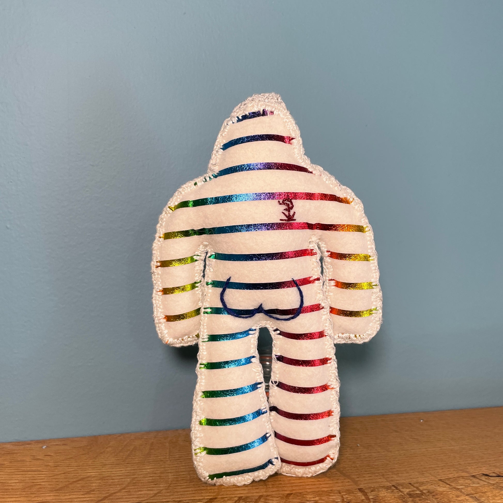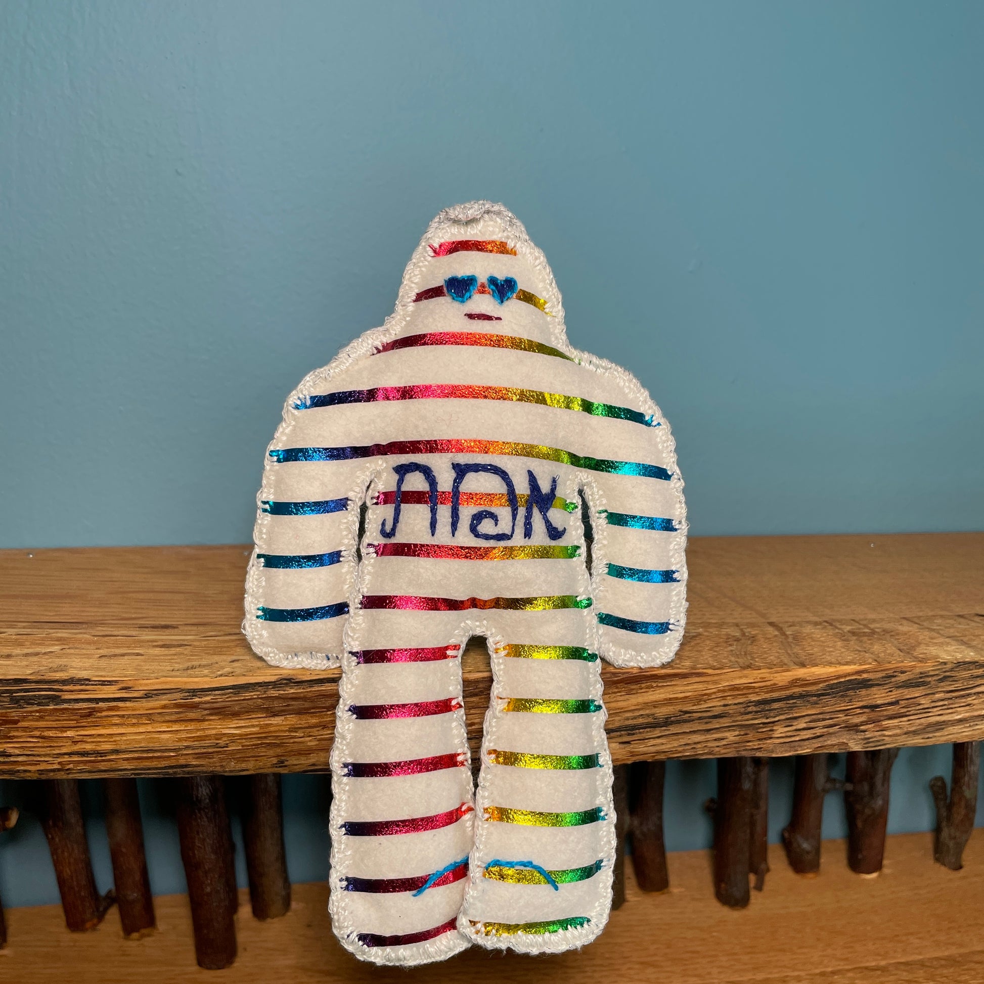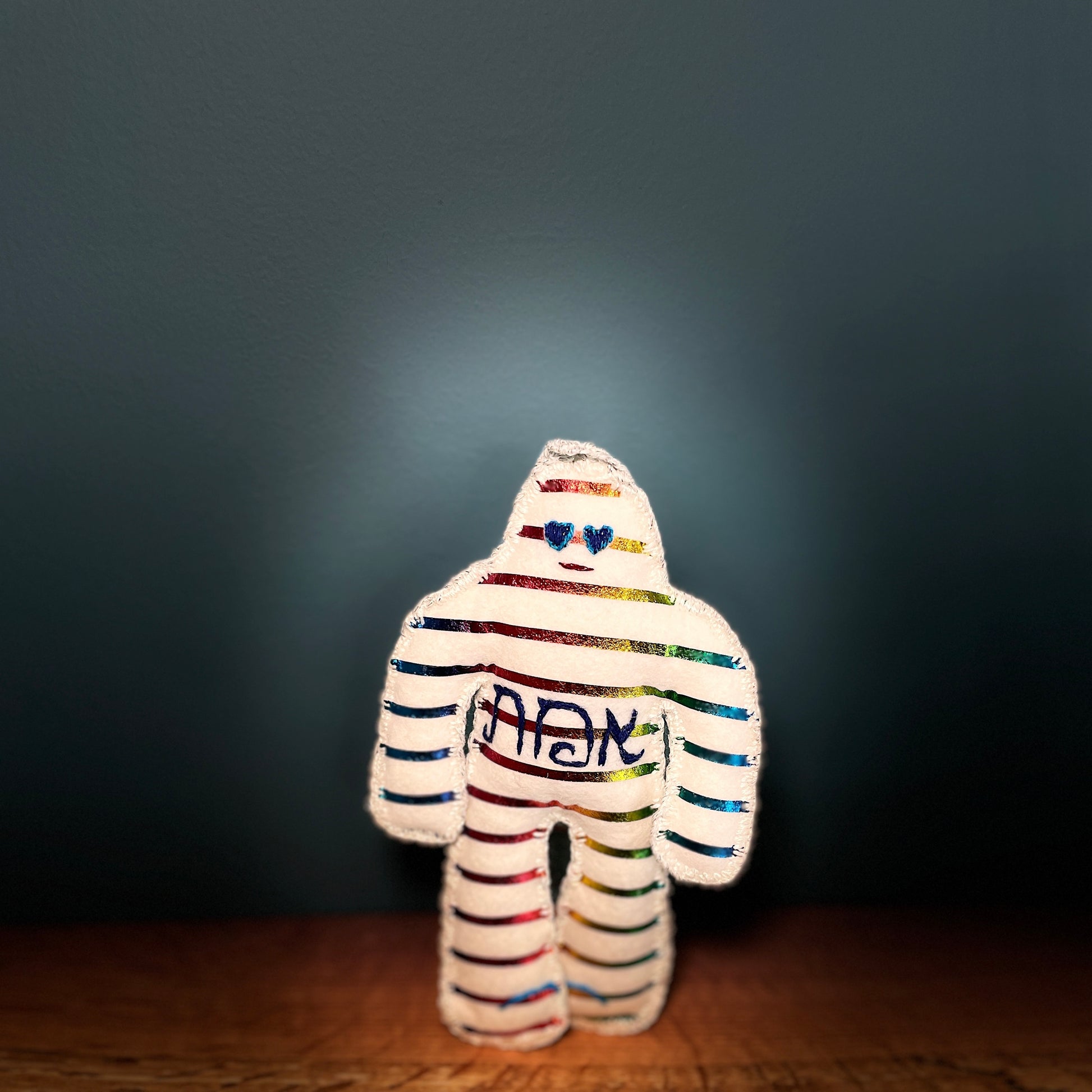 The golem/et is have the Hebrew word for truth (אמת) inscribed on its chest, which is an inherited practice. The Devotaj Sacred Arts golem/et of the COVID-19 pandemic can be specifically identified by a special symbol on their body. Some have it on each arm, others on their back, belly, or other location. This symbol is a “sigil” a power sigil that represents Psalm 33, which has been used in Jewish history to provide spiritual protection from plague and epidemics and inside each golem is a seed paper scroll with the final lines of Psalm 33 written on it in Hebrew sealed with an evil eye ward pin.