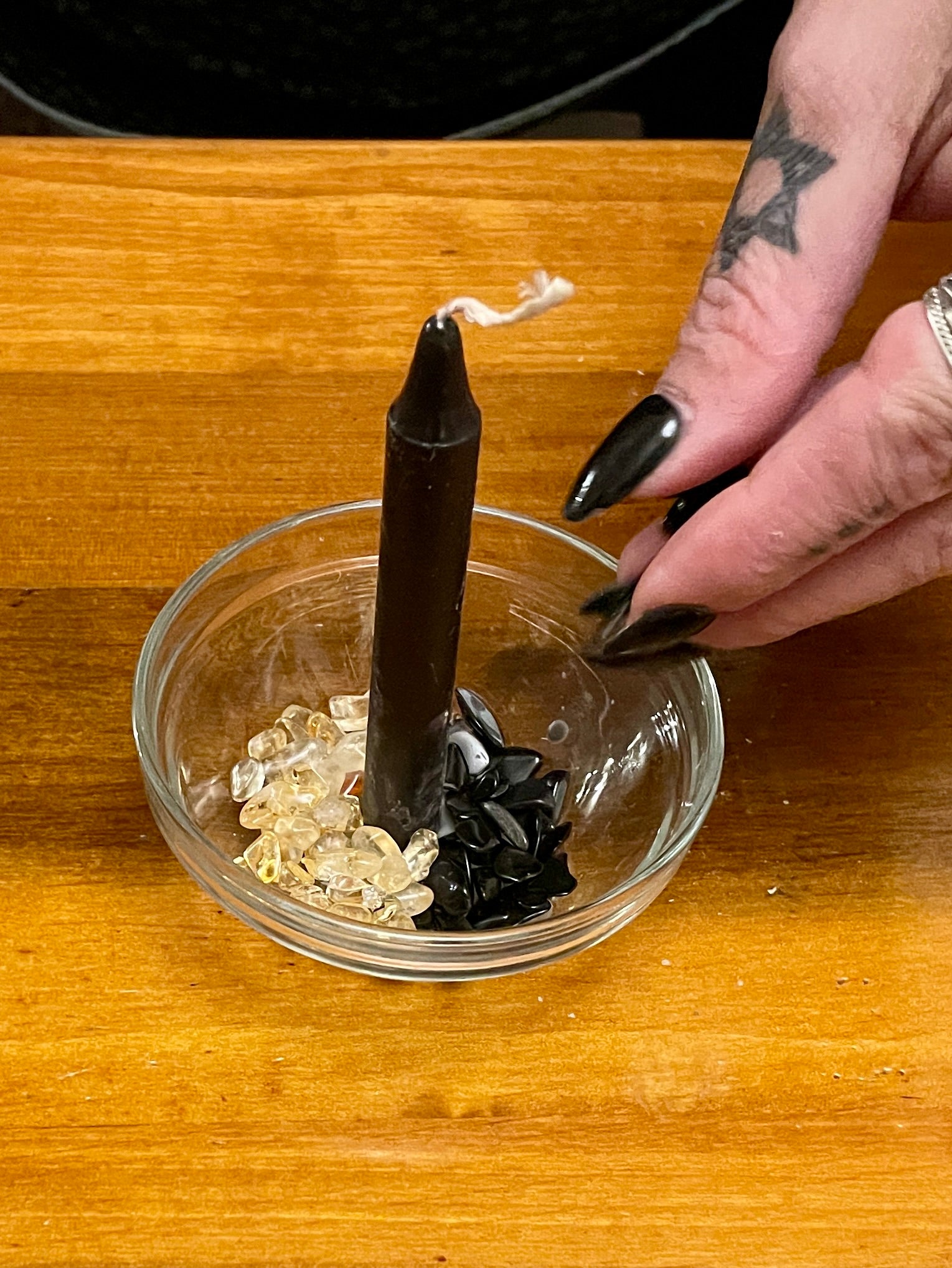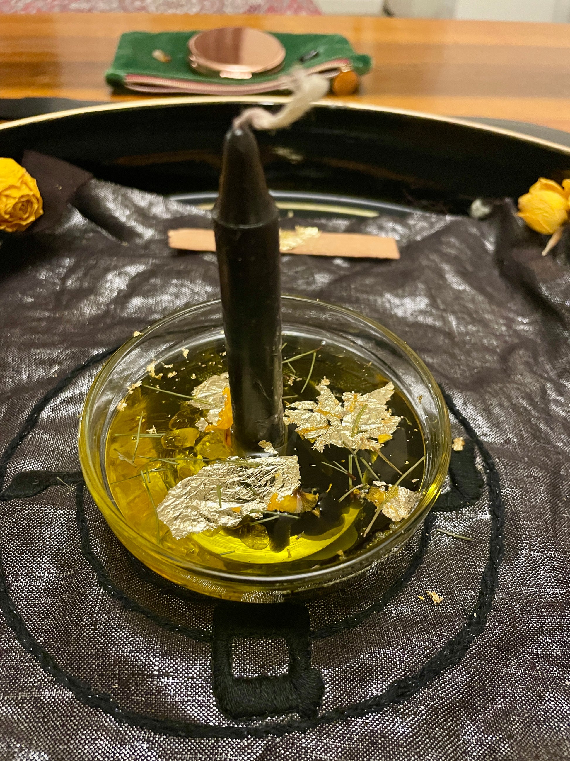 In the center of the altar was a bowl of oil. Grounded with citrine and onyx, and layered with flakes of gold, pine, cedar smoke, and energy. A black candle burned in the center to gather in the deepest darkness. We reached into the depths and drew out resilience, rootedness, and the willingness to prepare and recognize opportunities.