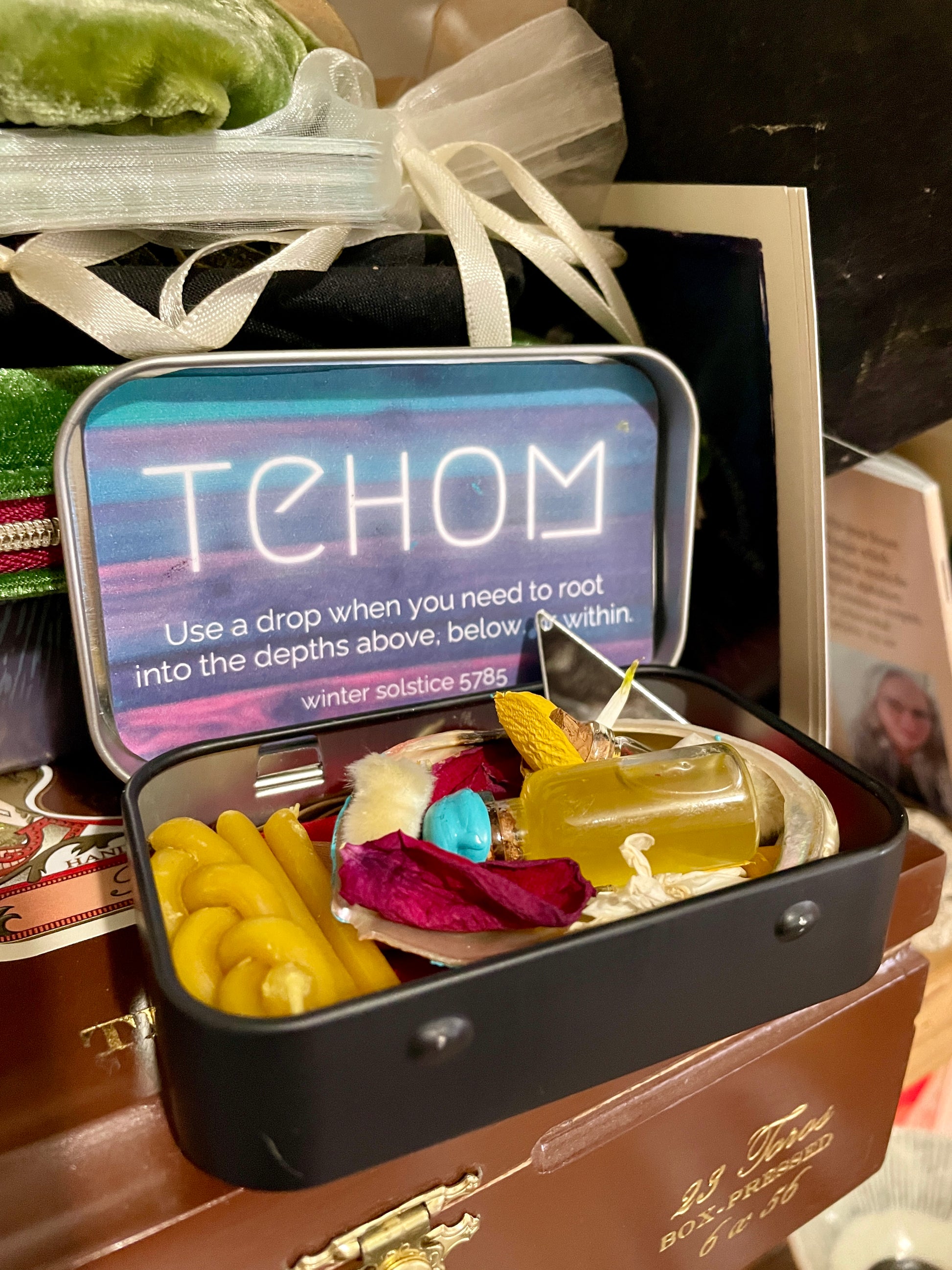 Nestled in the bottom of the tin is an picture of our solstice altar, to connect your kit to our working and act as a portal to the magiq.